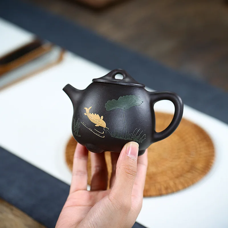 BEST QUALITY Yixing Dark-red Enameled Pottery Teapot Raw Ore Black Gold Sand Mud Painting Fish Interest High Sto